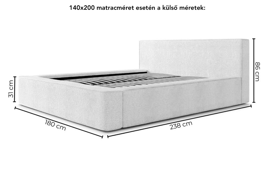 Példa: 140x200 cm-es matrac esetén az ágy teljes mérete: 180x238 cm