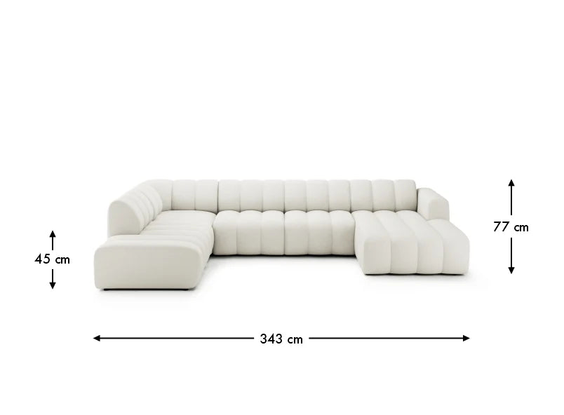 Az U alakú kialakítás rendkívül praktikus, hiszen nagy ülőfelületet biztosít, így egyszerre több ember kényelmesen elfér rajta. A mély ülőfelületek és a puha háttámlák a mindennapi kényelemről gondoskodnak, miközben a kanapé elegáns központi eleme lesz otthonának.