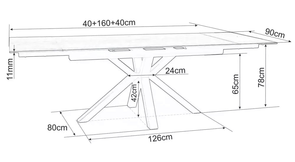 Az asztal alapmérete 160×90 cm, amely ideális 6 személy számára. A praktikus bővíthető funkció révén a hossz 240 cm-re növelhető, így akár 8–10 személy is kényelmesen elfér körülötte. Ez teszi a Castello modellt tökéletes választássá családi vacsorákhoz, vendégfogadásokhoz.