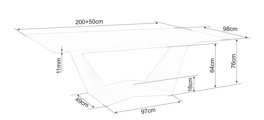 Az asztal alapmérete 200×98 cm, amely kényelmes ülőhelyet kínál 8 főnek. A praktikus toldóelemnek köszönhetően a hossz 250 cm-re bővíthető, így akár 10 személy számára is ideális választás.