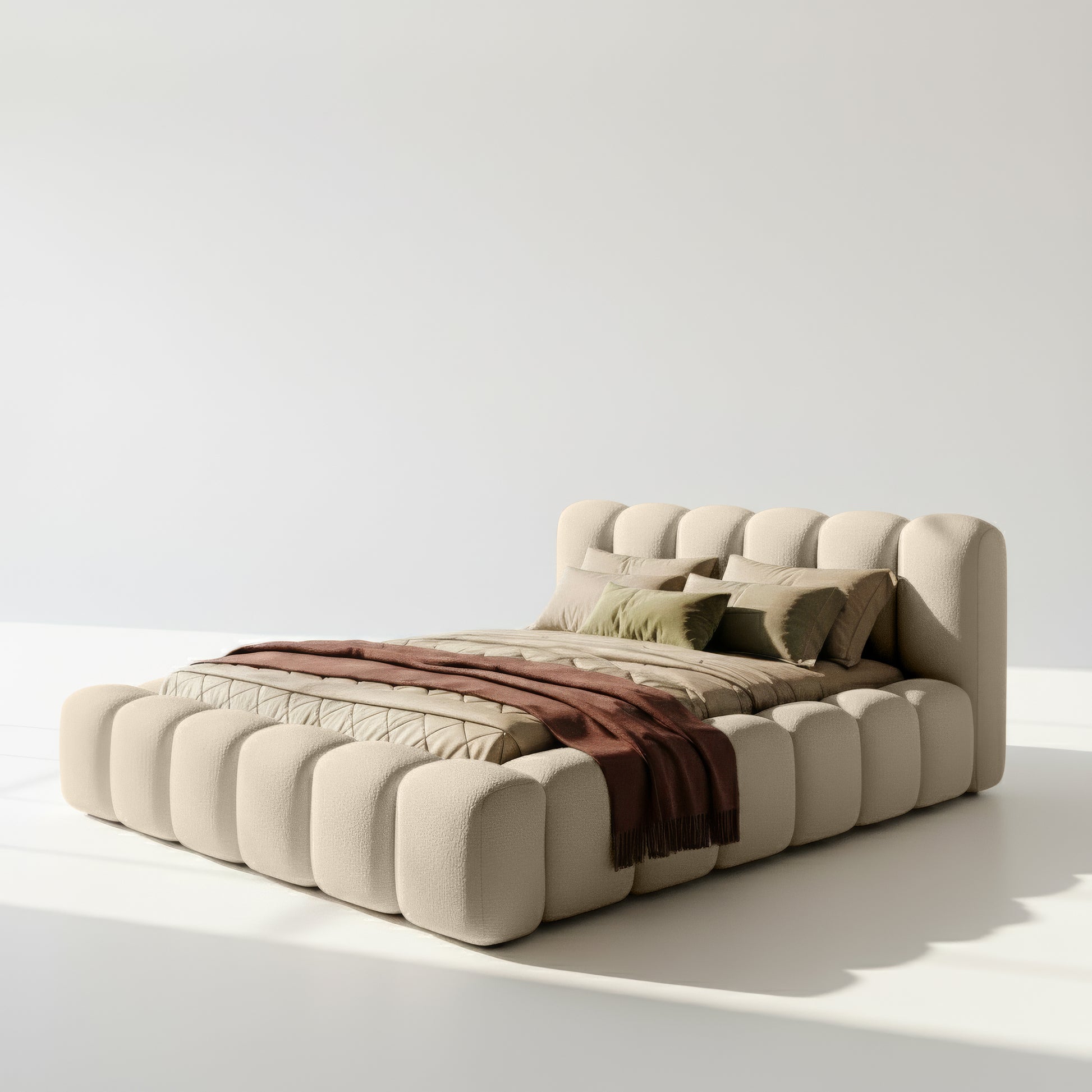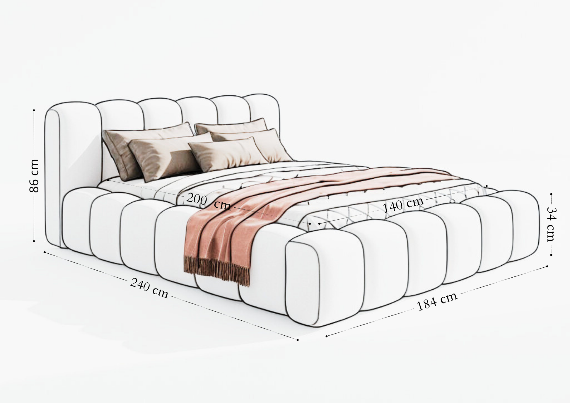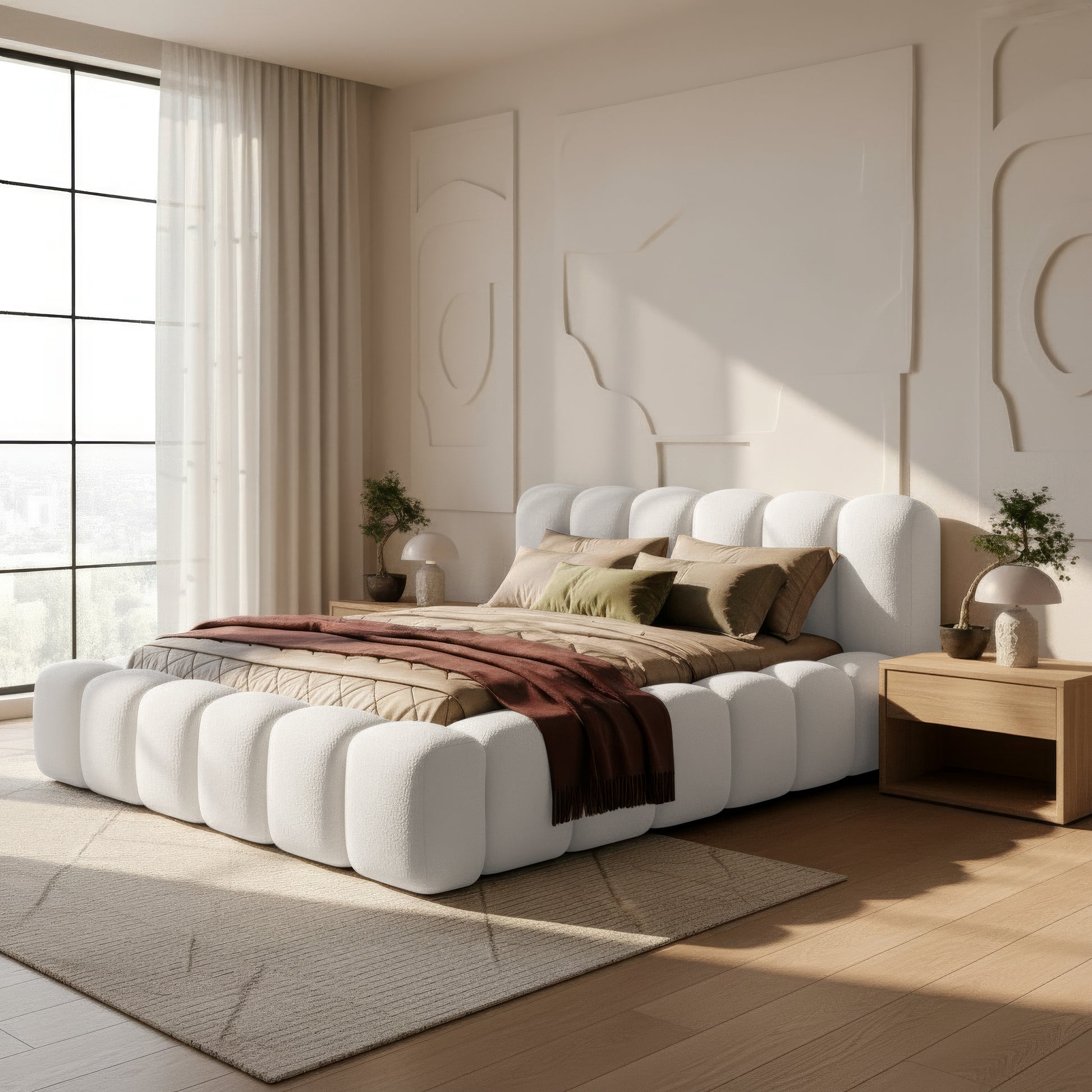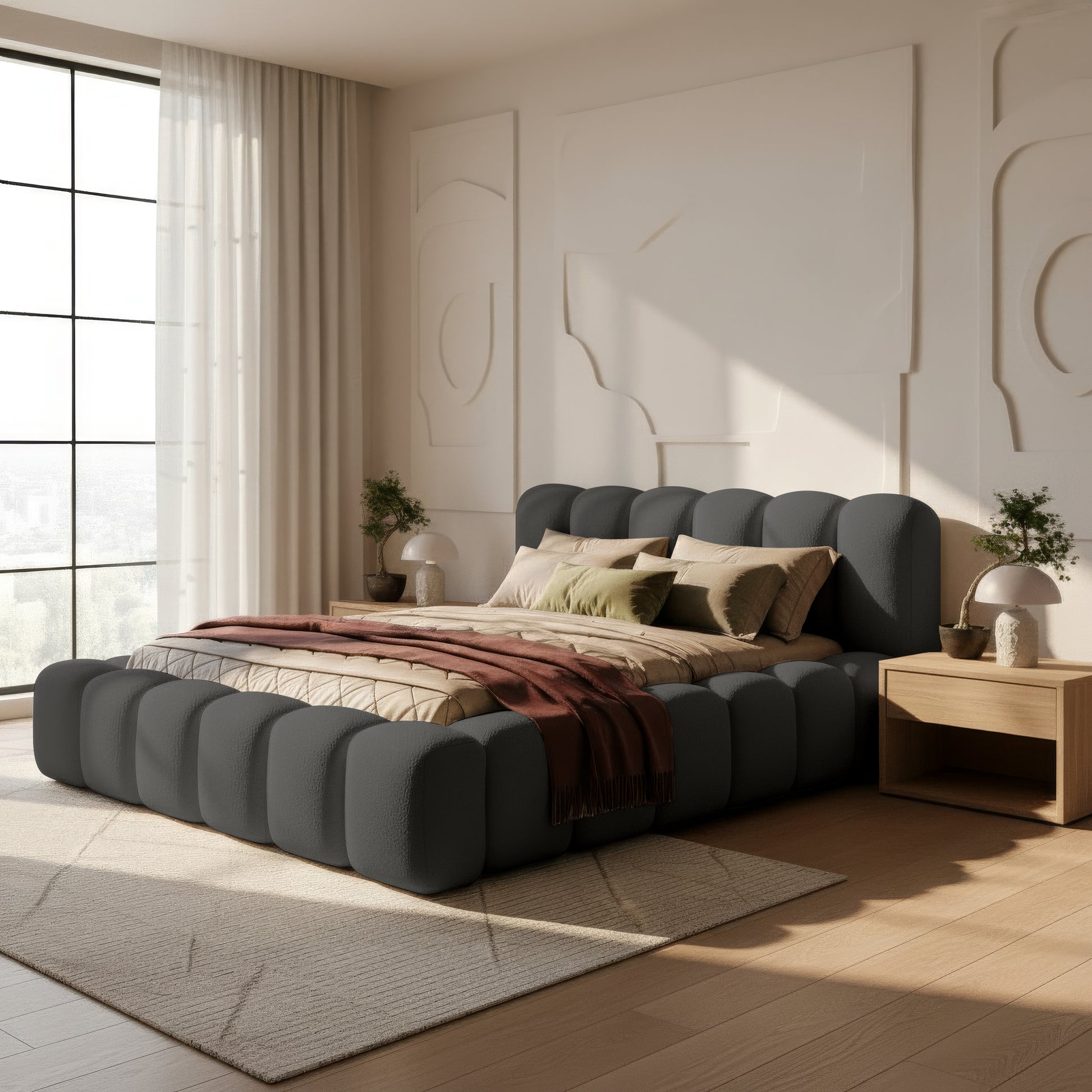 A Dream Boucle kárpitozott franciaágy modern megjelenésével és praktikus kialakításával a kényelmes pihenés megtestesítője. Ez a különleges designnal rendelkező bútor kiváló minőségű, kellemes tapintású szövetből készült, amely eleganciát és nyugalmat hoz a hálószobádba.