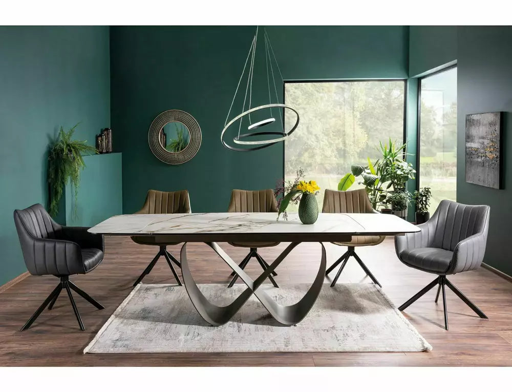 Az Infinity prémium étkezőasztal a modern olasz elegancia megtestesítője. Az asztallap különleges szerkezettel készült: edzett üvegre épített spanyol kerámia (Amber Bianco), amely elegáns márványhatású kivitelben érhető el. A felület nemcsak luxus megjelenést nyújt, hanem rendkívül praktikus is: karcálló, hőálló, nedvességálló és könnyen tisztítható.