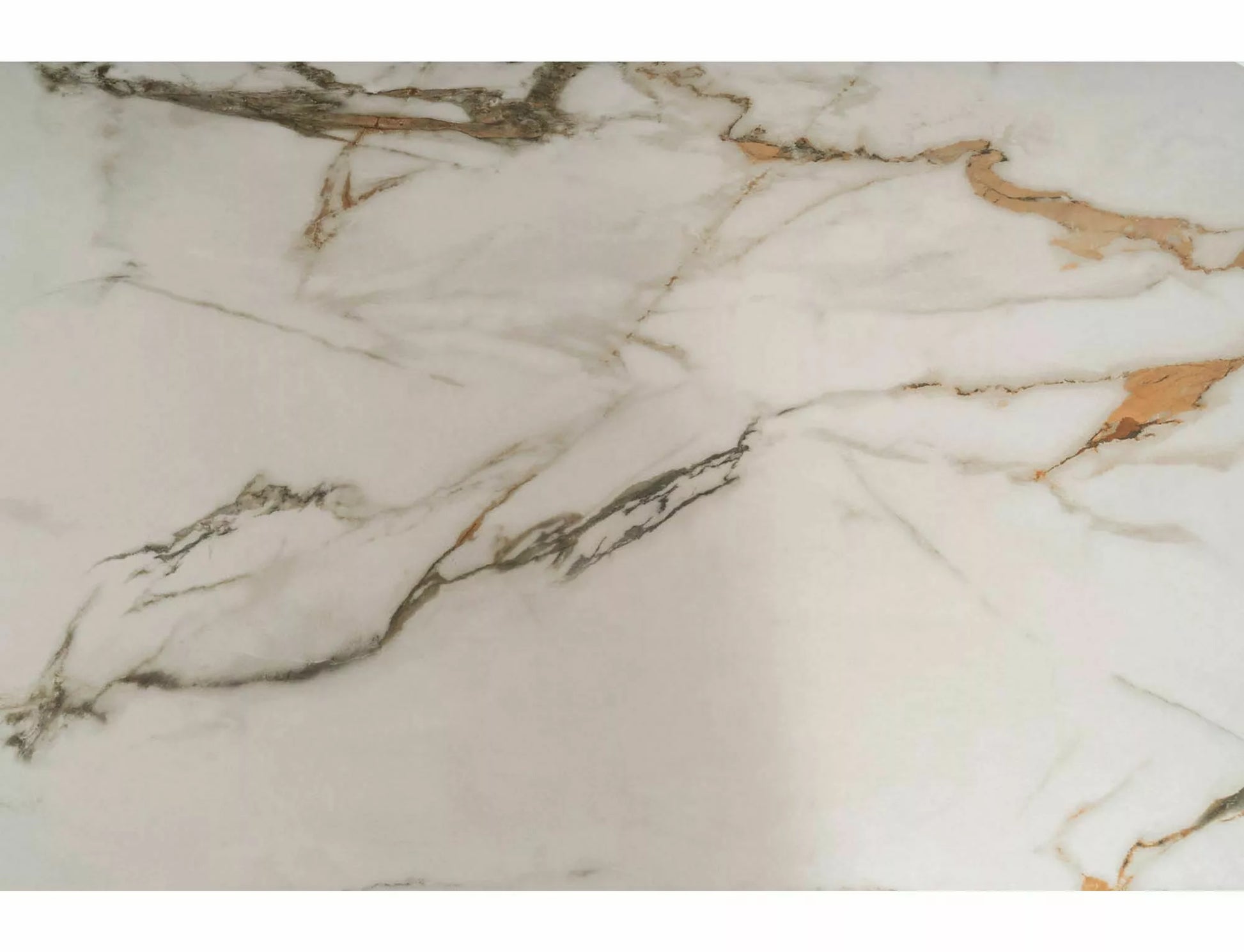 - Infinity Amber Bianco – fehér-arany márványhatású kerámia lap, fémes színű fémlábakkal