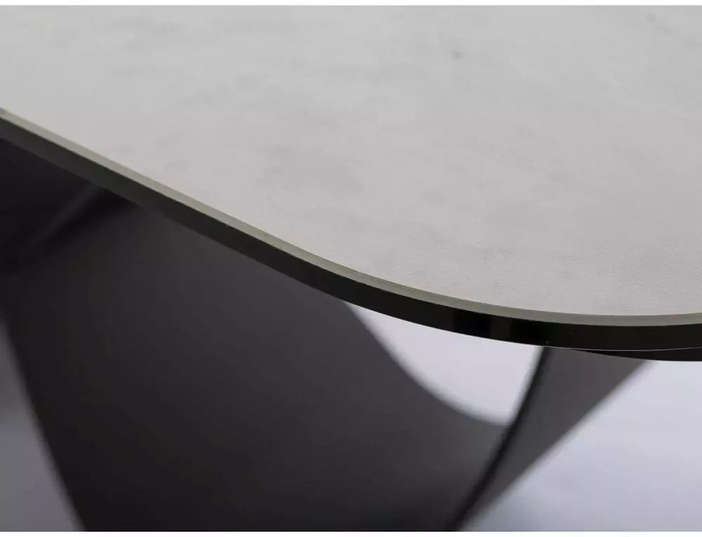 Az Infinity prémium étkezőasztal a modern olasz elegancia megtestesítője. Az asztallap különleges szerkezettel készült: edzett üvegre épített spanyol kerámia (Amber Bianco), amely elegáns márványhatású kivitelben érhető el. A felület nemcsak luxus megjelenést nyújt, hanem rendkívül praktikus is: karcálló, hőálló, nedvességálló és könnyen tisztítható.