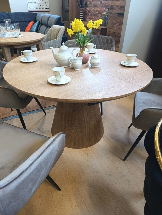Az kerek formájú asztal bővíthető, így könnyedén alkalmazkodik a mindennapi használat és a vendégfogadás igényeihez. Alapméretben ideális családi étkezésekhez, bővítve ovális alakot vesz fel és akár 8 személy számára is kényelmes helyet biztosít. A praktikus bővíthető mechanizmusnak köszönhetően pillanatok alatt nagyobb felületet nyerhetünk.