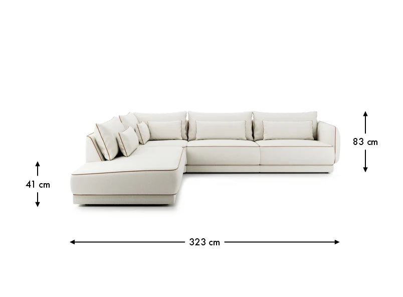 Egyedi megjelenését a vegán bőrből készült díszvarrás emeli ki, amely finoman hangsúlyozza a kanapé kontúrjait, modern és elegáns karaktert kölcsönözve neki. Moduláris felépítése lehetővé teszi, hogy a kanapé a nappali központi elemeként funkcionáljon, miközben tökéletesen illeszkedik a tágas enteriőrökhöz.